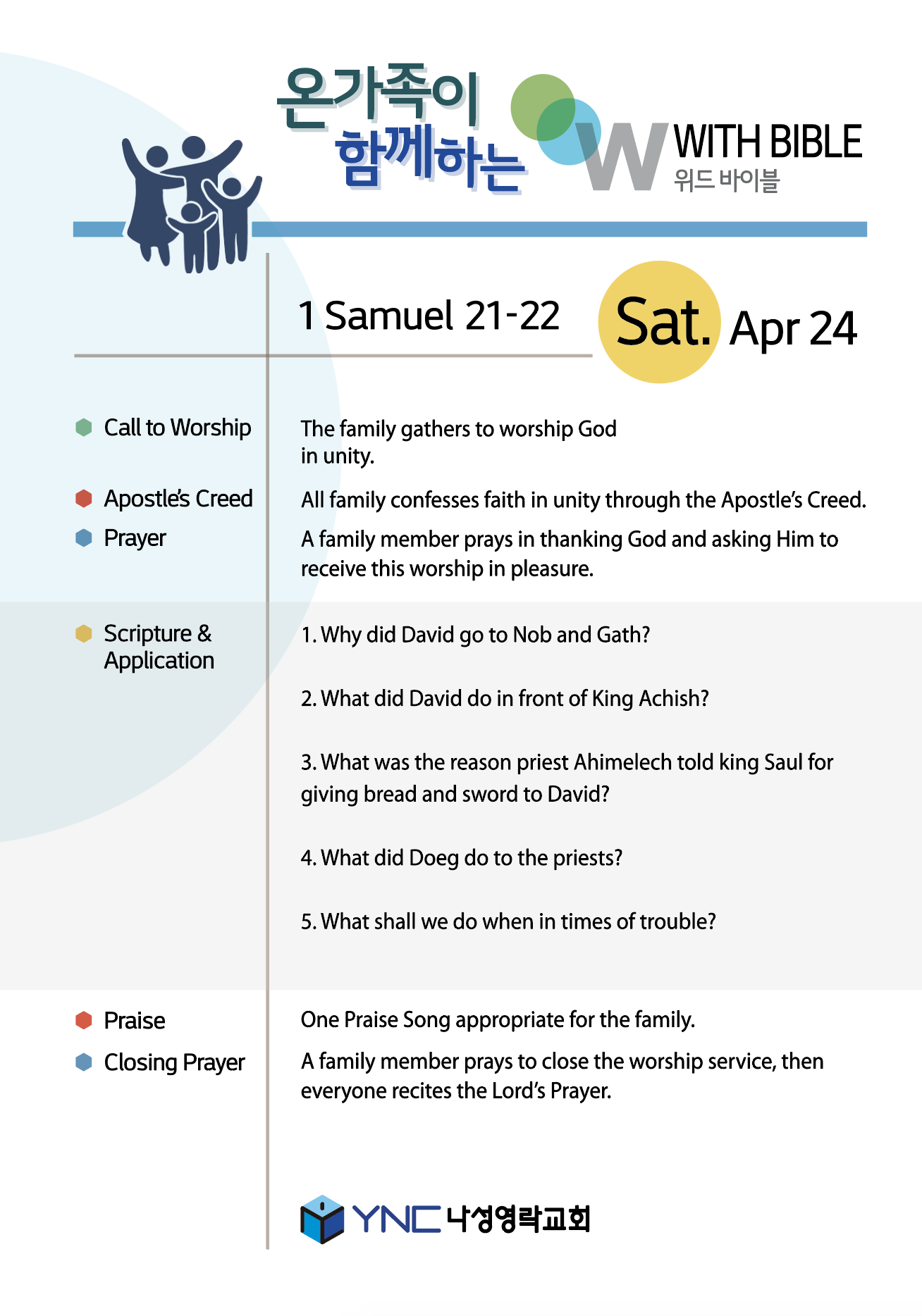 The family gathers to worship God in unity.