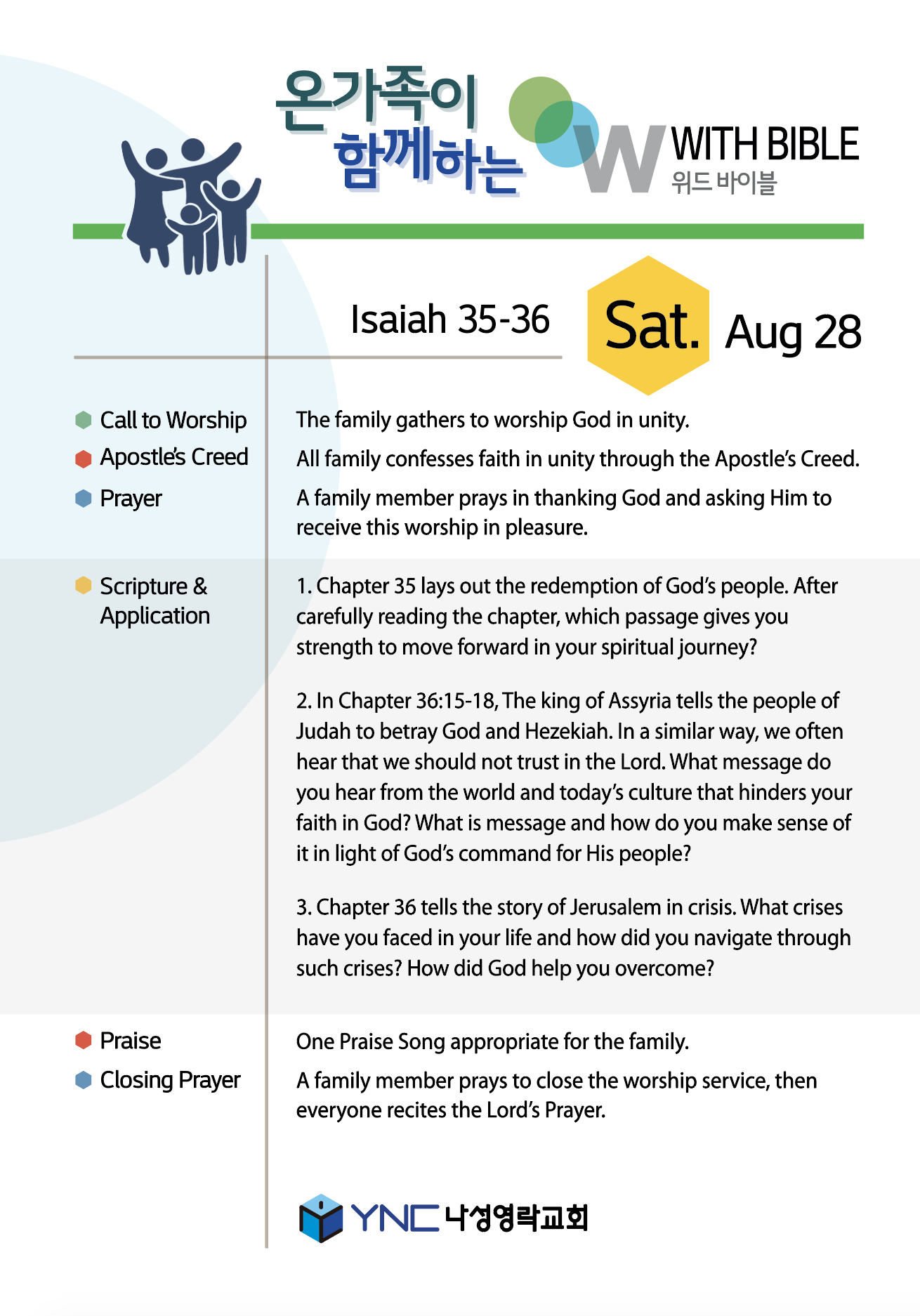 The family gathers to worship God in unity.